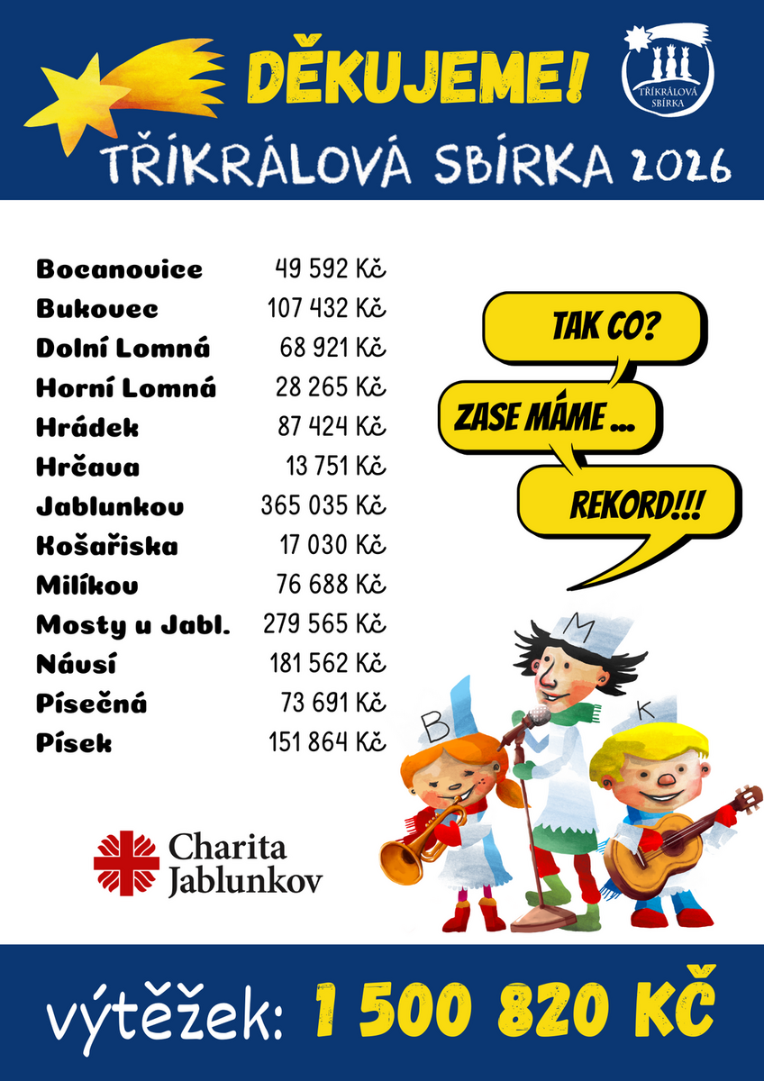 V pokladničkách našich králů se letos nasbíralo rekordních 1 500 820 Kč. Každý rok si říkáme, že už to snad ani nemůže být lepší… a přesto nás znovu překvapíte. Vaše štědrost, ochota pomáhat a obětavost jsou tím největším darem, který dělá z Tříkrálové sbírky něco velkého a nezapomenutelného. Díky vám můžeme pokračovat v pomoci potřebným v našem širokém okolí – ať už jde o seniory, nemocné, zdravotně znevýhodněné, děti, rodiny v nouzi, lidi bez domova a mnoho dalších. Zároveň můžeme realizovat projekty, které by bez podpory veřejnosti třeba ani nikdy nevznikly.